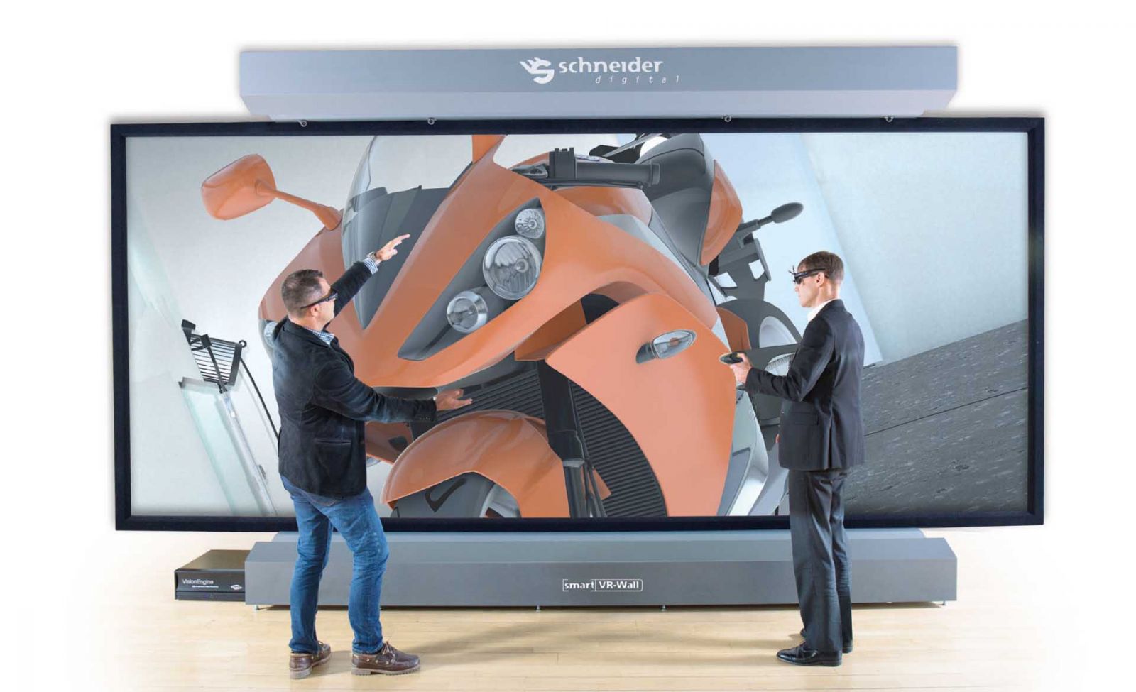 Das High-End-Rendering von digitalen Prototypen ist der Realität immer dichter auf den Fersen. Bekannte Universitäten und Firmen aus Chemie, Pharma, Automobil- und Flugzeugindustrie nutzen Virtual Reality, um ihren Produkten den letzten Schliff zu geben – und setzen auf die smart VR-Wall von Schneider Digital (Miesbach). So etwa Airbus Defense, Audi, Daimler, Honda, Johnson & Johnson, Siemens Mobility und VW. Die Lösung beweist, dass ein 3D-Modell auf der Leinwand inzwischen nahezu identisch mit seinem realen Pendant sein kann – und dies im Maßstab 1:1. Lichtstarke Aufprojektion mit modernen Laser-Projektoren und ein neuartiges Pixel-Processing machen dies möglich. Das Standard-Außenmaß beträgt beim Typ „Cinemascope 305“ 6,26 m x 3,05 m (B x H), wobei die Standtiefe lediglich 70 cm erreicht.