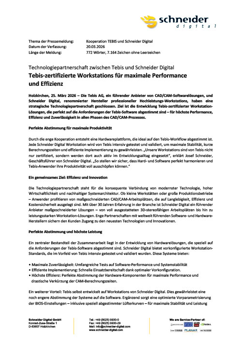 Die Tebis AG und Schneider Digital haben eine strategische Technologiepartnerschaft geschlossen, um Tebis-zertifizierte Workstation-Lösungen zu entwickeln. Ziel ist die optimale Abstimmung von Hard- und Software für maximale Performance, Effizienz und Stabilität im gesamten CAD/CAM-Prozess.