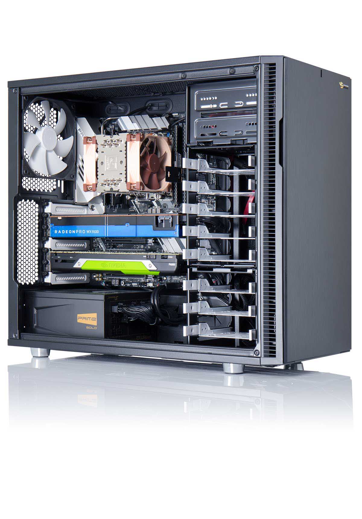 Optimal aufeinander abgestimmte, hochwertige Komponenten garantieren die maximale Leistungsfähigkeit und Langlebigkeit unserer Schneider Digital Workstations. Zum Beispiel werden professionelle Grafikkarten verwendet, die durch ihrer Zertifizierungen eine fehlerfreie Darstellung bei maximaler Beschleunigung Ihrer Applikation garantieren. Durch die Verwendung eines schallgedämmten Gehäuses und ausgeklügelter Lüfterregelung arbeitet jede Schneider Digital Workstation absolut geräuscharm bei optimaler Belüftung der Komponenten. Auf Wunsch erhalten Sie von uns auch Gehäuse für den Einbau im 19″-Rack.